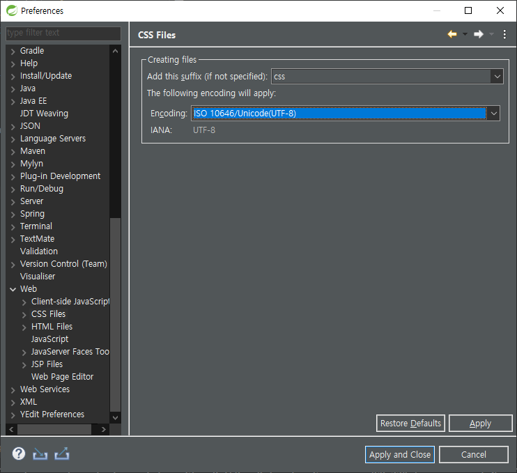 window - preferences - CSS Files, HTML Files, JSP Files => UTF-8 설정