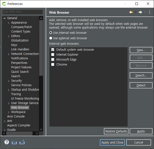 window - preferences - General - Web Browser 로 이동 후 Chrome 설정,