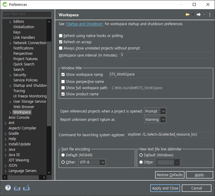 이클립스 내의 텍스트, jsp파일, 웹 페이지 에서 한글을 정상적으로 출력하기 위해서는 인코딩 형식을 바꿔주어야 한다. window - preferences - Workspace => UTF-8 설정 window - preferences - CSS Files, HTML Files, JSP Files => UTF-8 설정 파일의 인코딩 방식을 바꿔준 후, 이클립스 내의 텍스트 인코딩 방식도 변경 해준다. window - preferences - General - Content Types => 맨 아래에 UTF-8 추가 ** 꼭 Update버튼 을 눌러 적용시킬것 이렇게 하면 대략적인 한글패치? 는 끝난다. 하지만 웹브라우저에서는 여전히 한글이 깨진다. 이것도 수정하려면 window - preferences..